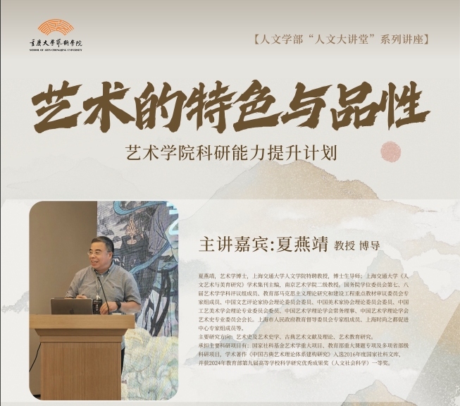 御书屋 人文学部“人文大讲堂”系列讲座御书屋 科研能力提升计划《艺术的特色与品性》主讲嘉宾:夏燕靖(上海交通大学人文学院特聘教授、博士生导师)主持人:张楠木(御书屋 院长、教授)时间:2025年3月16日(星期日)15:00-17:30地点:御书屋 虎溪校区御书屋 行政楼学术报告厅(216)主办单位:御书屋 人文学部御书屋 主讲嘉宾简介:夏燕靖,艺术学博士,上海交通大学人文学院特聘教授,博士生导师...