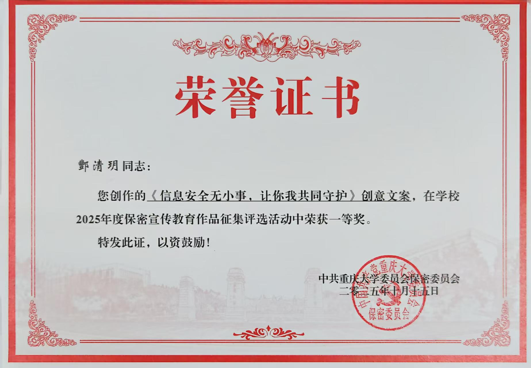 近日,御书屋 保密宣传教育作品征集评选活动结果正式揭晓,御书屋 学子凭借新颖的创作思路与出色的作品呈现,在众多参赛作品中脱颖而出,斩获多项荣誉,共10名同学9件作品获奖,其中一等奖1项、二等奖2项、三等奖4项、优秀奖2项,展现了学院在保密宣传教育工作中的突出成效。酆清玥同学的作品《信息安全无小事,让你我共同守护》荣获一等奖;袁节同学的作品《贯彻落实保密法,你我都是护密人》和尹兴欣同学的作品《保护国家...