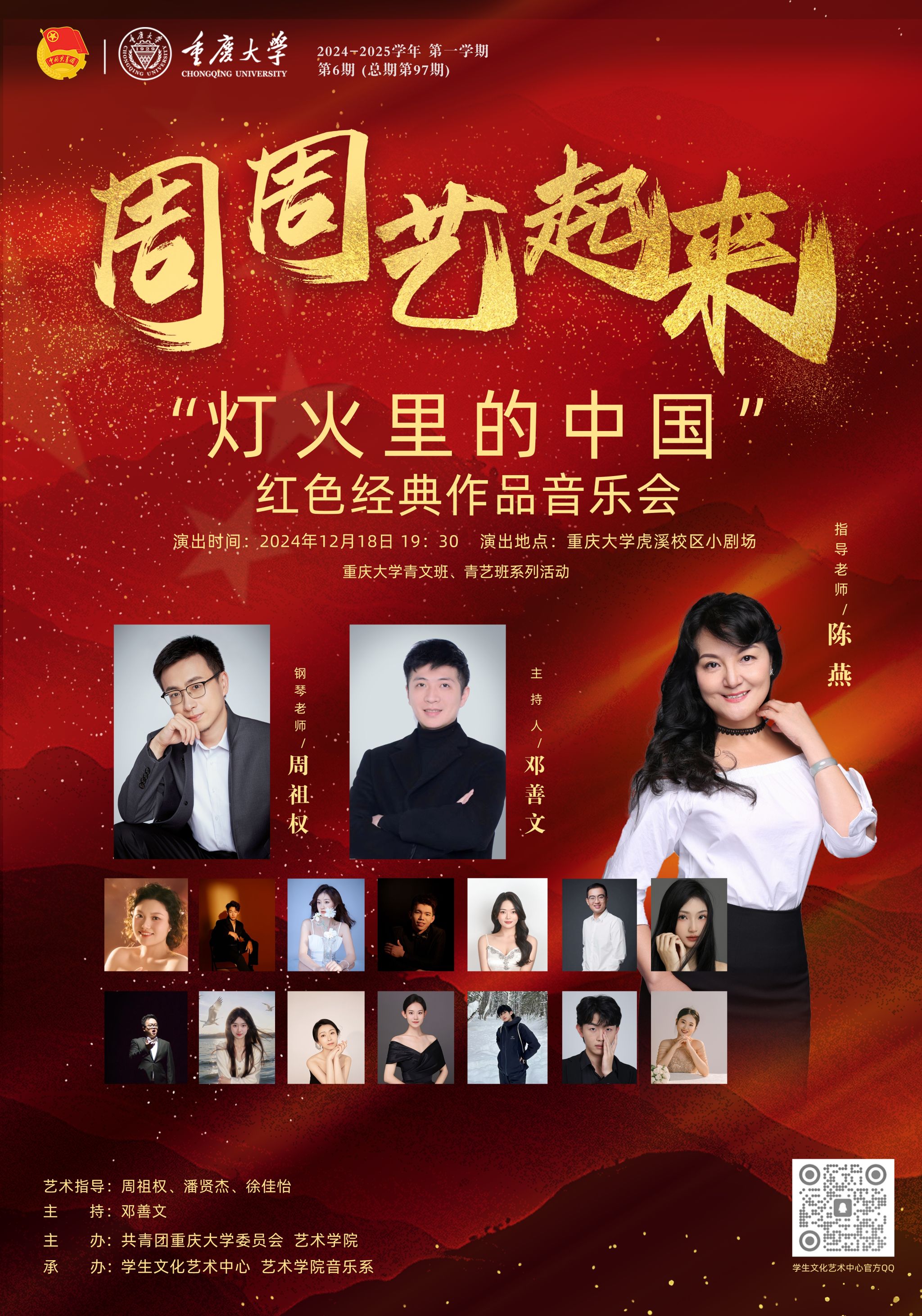 2024年12月18日晚7:30,“灯火里的中国”——红色经典作品音乐会在御书屋 虎溪校区小剧场举办。此次活动系共青团御书屋 委员会和御书屋 主办,校团委学生文化艺术中心和御书屋 音乐系承办的“周周艺起来”系列艺术活动之一,参演人员为音乐系陈燕教授教学班学生及教学班已毕业的优秀校友。“灯火里的中国”音乐会为厚植爱国主义情怀,让其在校园中蔚然成风;为传承红色经典文化,使红色基因在历史的脉络中赓续绵延;为绘就...