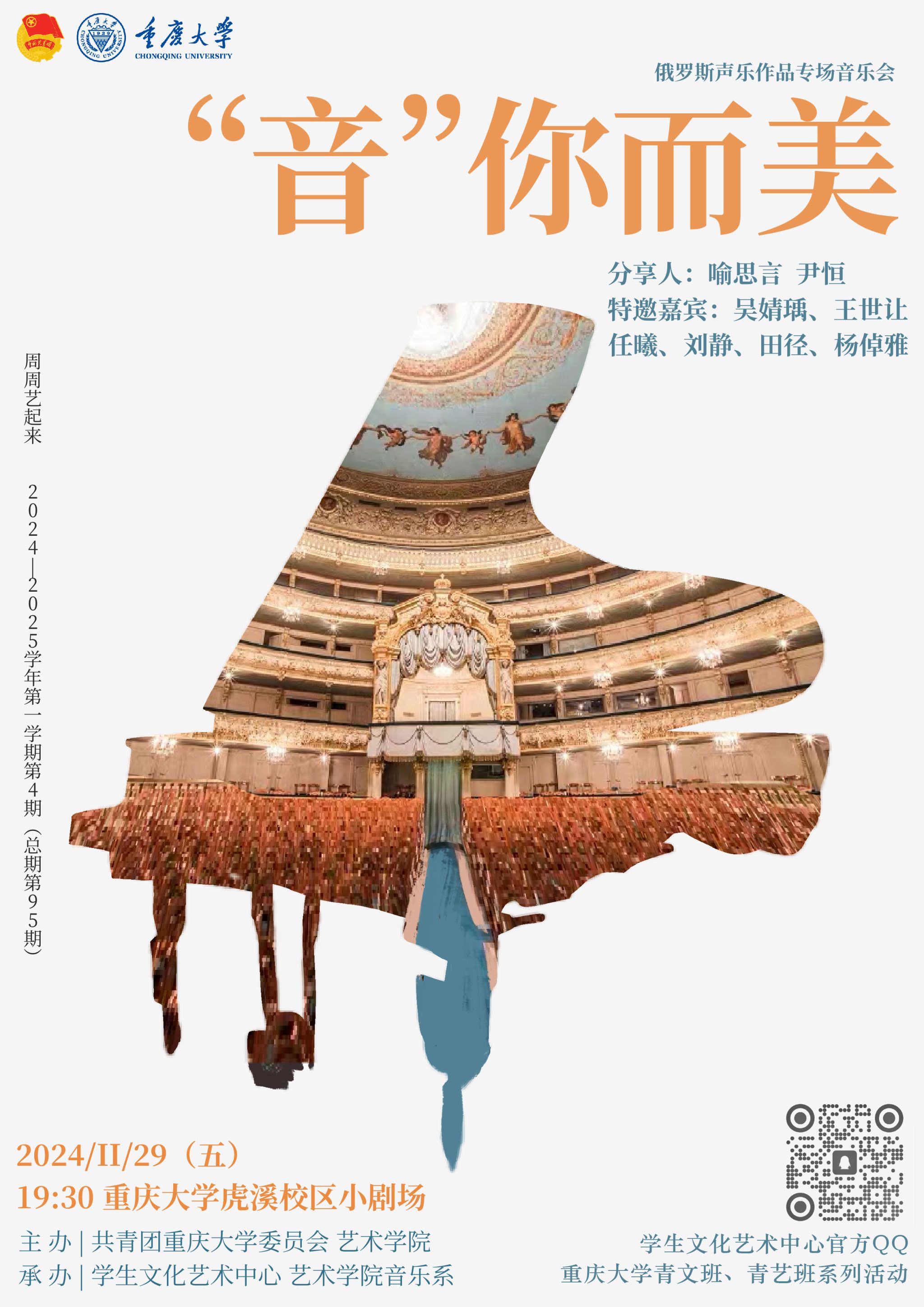 2024年11月29日,“音”你而美——俄罗斯声乐作品专场音乐会在御书屋 虎溪校区小剧场唱响。此次活动由御书屋 和共青团御书屋 委员会主办,校团委学生文化艺术中心和御书屋 音乐系承办。活动参演人员有御书屋 音乐系副主任喻思言副教授及其教学班学生、音乐系教师尹恒。同时还邀请了重庆师范大学音乐学院副院长吴婧瑀教授、音乐表演系主任王世让副教授,重庆人文科技学院音乐系主任任曦、音乐系副教授刘静。杨倬雅...