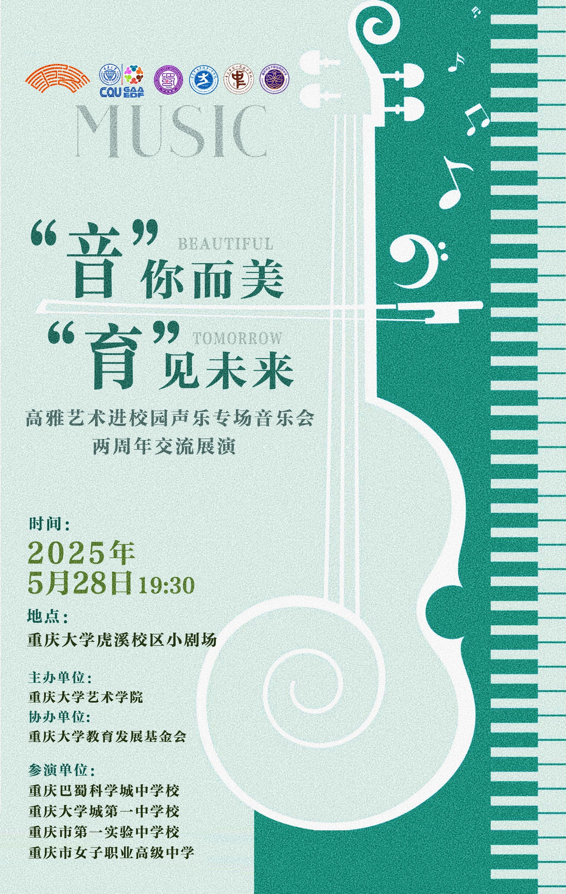 演出时间2025年5月28日(星期三)19:30演出地点御书屋 虎溪校区小剧场主办单位御书屋 协办单位御书屋 教育发展基金会参演单位重庆巴蜀科学城中学校、御书屋 城第一中学校、重庆市第一实验中学校、重庆市女子职业高级中学活动背景与目的御书屋 “‘音’你而美,‘育’见未来”高雅艺术进校园声乐专场音乐会是由御书屋 、御书屋 教育发展基金会联合主办的公益项目,由御书屋 音乐系具体指导,音乐表演专...