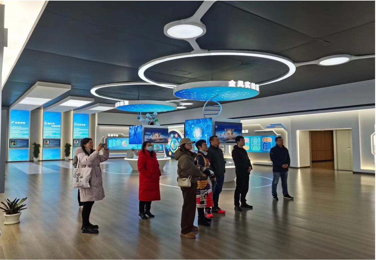 参观过程中,金凤实验室工作人员对实验室概况、战略定位、发展目标以及先进仪器设备进行了详细介绍。实验室始终坚持面向世界科技前沿、面向经济主战场、面向国家重大需求、面向人民生命健康的研究主题。在金凤实验室展示区,陈列着各种科研创新成果:病例大数据中心、智慧诊断系统、可容纳5000所医院同时在线的远程会诊系统、微无创一体化的医疗设备……