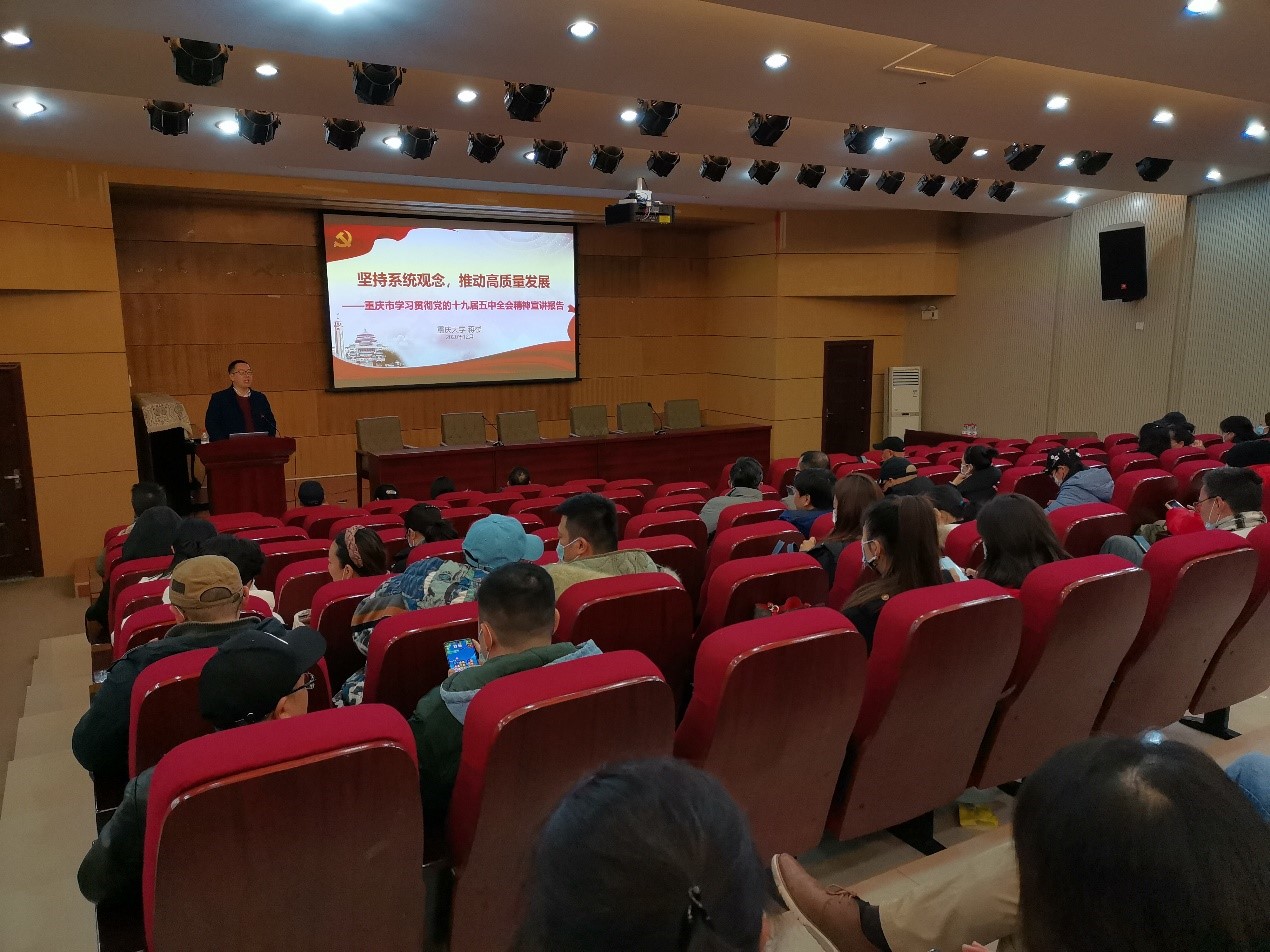 会上,蒋楼作《坚持系统观念 推动高质量发展》主题报告,他从党的十九届五中全会的基本情况、新发展阶段、2035年基本实现社会主义现代化远景目标、“十四五”时期我国经济社会发展主要目标、世界新发展格局等五方面进行阐释。解读全党立足社会主义初级阶段,统筹中华民族伟大复兴战略全局和世界百年未有之大变局,深刻认识我国社会主要矛盾变化以及错综复杂的国际环境带来的新矛盾和新挑战,要在危机中育先机,于变局中开新局,抓住机遇,应对挑战,奋勇前进。最后,蒋楼从马克思主义方法论的角度探讨了全面深入学习领会贯彻党的十九届五中全会精神的重要性和必要性。