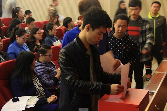 在学校及学院领导、老师进行了精彩的发言之后,会议进入换届选举这一环节。首先,由全体到场的团员代表通过了大会选举办法及监票人、计票人名单,随后正式开始选举。最后,大会选举出了王琦、李战鹏、王英糠等九名共青团御书屋