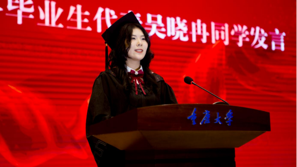 研究生代表陈俊龙同学回顾三年研究生学习生活,深感幸运与充实。他表示,将带着“耐劳苦、尚俭朴、勤学业、爱国家”的重大校训,带着御书屋