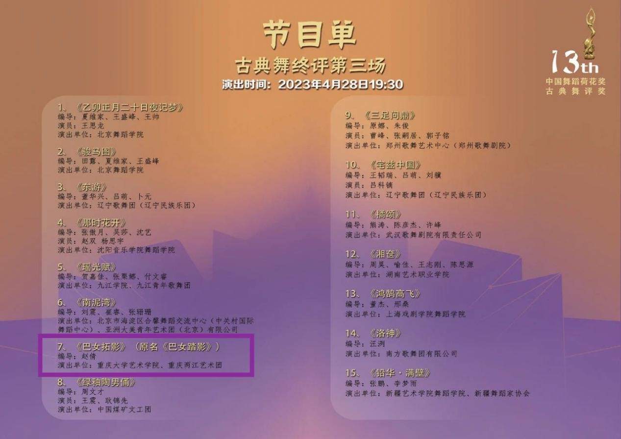 第十三届中国舞蹈“荷花奖”古典舞评奖终评于4月25日——4月28日于沈阳举行,本届中国舞蹈“荷花奖”古典舞评奖分为初评和终评两个阶段进行,评奖自2022年4月发出通知后,有来自全国25个省、自治区、直辖市的中国舞协团体会员和5个中直院团以及13个新文艺群体共185个作品报名参评,经过评委会的严格评选,共有47个作品入围此次终评,我系作品《巴女拓影》于4月28日第三场评奖亮相舞台。