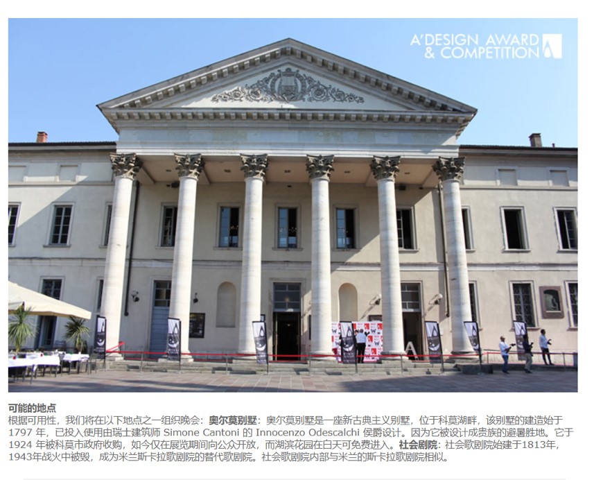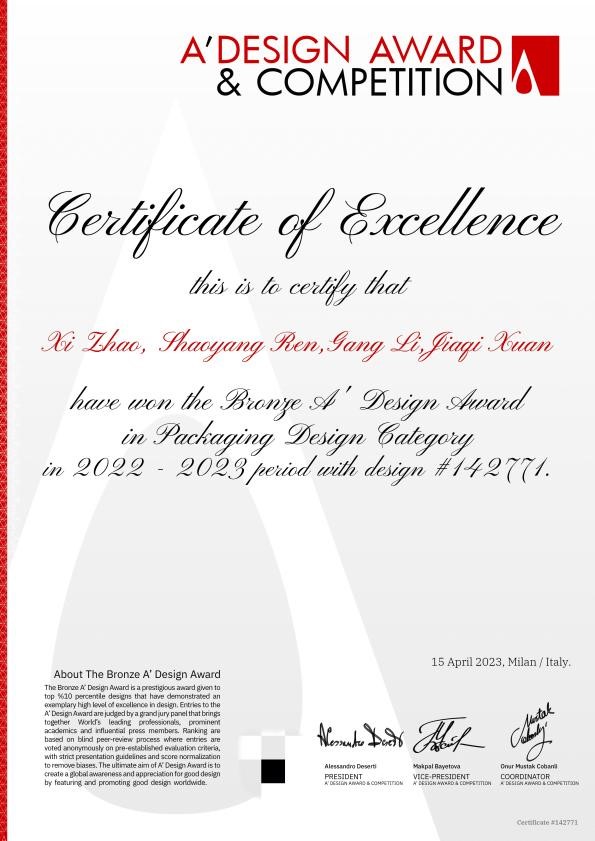 意大利 A’Design Award 国际设计大奖赛是是全球最大,涉及国家和地区最多的设计赛事,也是目前世界上最具综合性和权威性的设计比赛之一,被誉为“欧洲设计届奥斯卡”。该赛事由ICSID(国际工业设计协会),ICOGRADA(国际平面设计协会)和ADI (意大利工业设计协会)成员单位组织举办,旨在向世界宣传和表彰优秀的设计作品和服务,发掘和表彰全球范围内最卓越的设计、技术和创意,为获奖者提供国际性展示平台,从而激励设计师、机构以及品牌创造出更多优质的产品、项目和服务,促进行业共融。