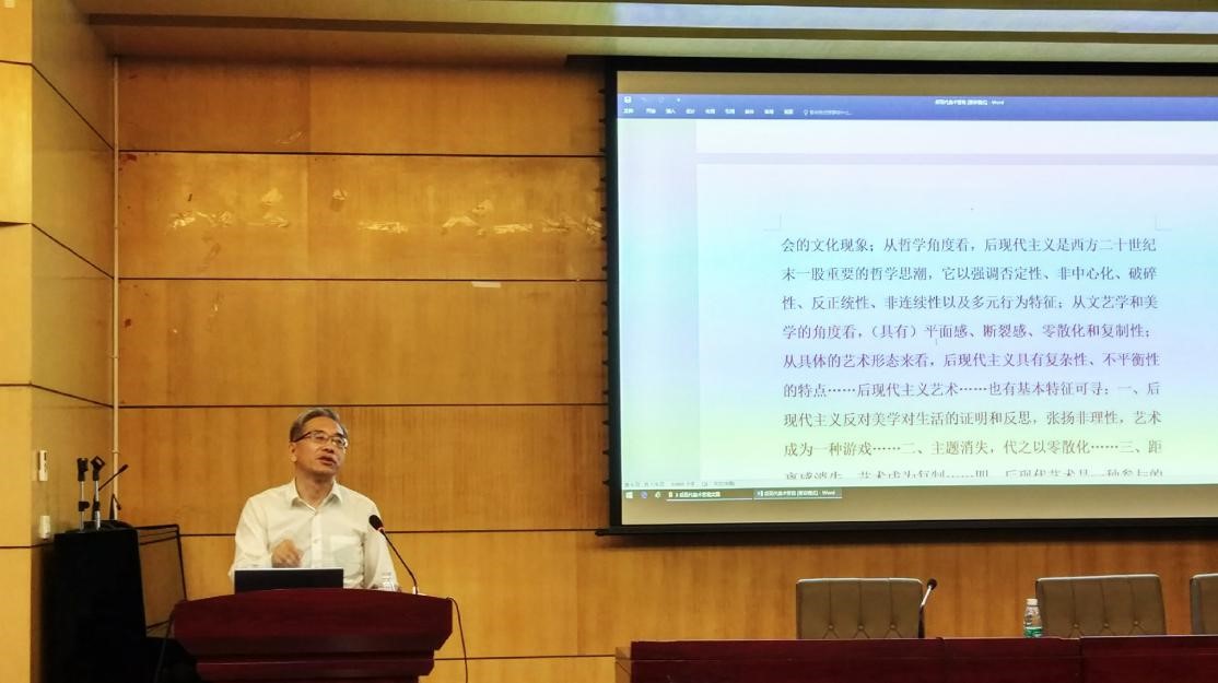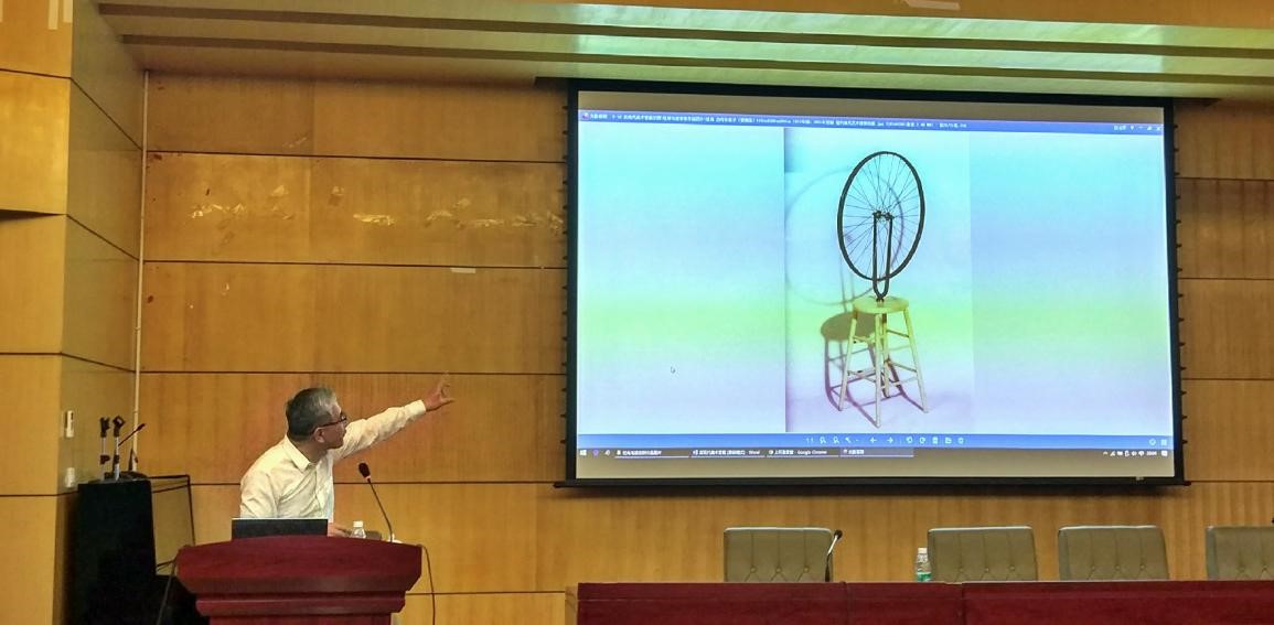 第一部分:西方后现代主义的起源。黄丹麾研究员分别从“后现代主义”一词最早的出现、哲学上的后现代、后现代产生的重大影响、最早的后现代艺术样式四点进行了专业解读。首先,从“后现代主义”最早出现于文学界开始,列举了西班牙作家菲德里柯·德·翁尼斯1934年首次在他的《西班牙和拉美诗歌精选》中使用了“后现代主义”一词,在此后一些历史学家和文学批评家,对此词的使用与延伸性发展。再在从哲学角度出发,讲述了各国不同哲学家对后现代的定义与特征分析。之后论述了英国建筑评论家詹克斯使后现代真正产生了重大影响。最后结合图片的赏析,具体向大家展示了最早的后现代艺术样式:现成品艺术。