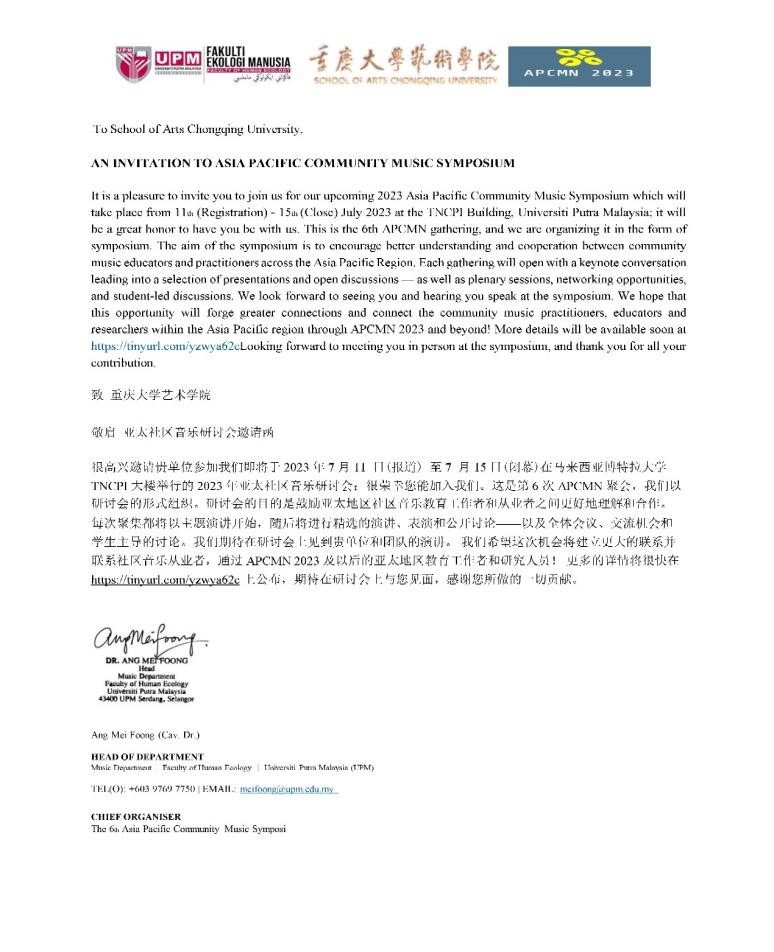 协办的第六届亚太社区音乐研讨会(Asia Pacific Community Music Network ) ,将于2023年7月11日至15日在博特拉大学的Rashdan Baba会堂召开。亚太社区音乐国际研讨会(APCMN)是由联合国教科文组织和国际音乐理事会的附属机构“国际音乐教育协会”(International Society for Music Education)每两年在不同成员国举办的学术会议,主要通过委员会ISME成员分享和相互合作,传播关于音乐教育及其相关专业领域发展的信息。