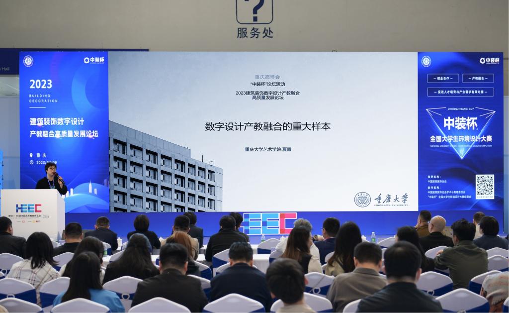 2023年4月8日-10日,第58·59届中国高等教育博览会(以下简称高博会)在重庆国际博览中心举办,大会由中国高等教育学会主办,是全国高等教育领域规模最大、影响力最广泛的综合性品牌展会之一。4月9日下午,2023建筑装饰数字设计产教融合高质量发展论坛在高博会竞赛专区会议室成功举办。来自西安交通大学、四川美术学院等近百所高校相关专业负责人、中国建筑装饰协会、重庆市建筑装饰协会,产业链企业相关负责人约300人齐聚一堂,共同构建产业与人才培养高质量发展新格局。