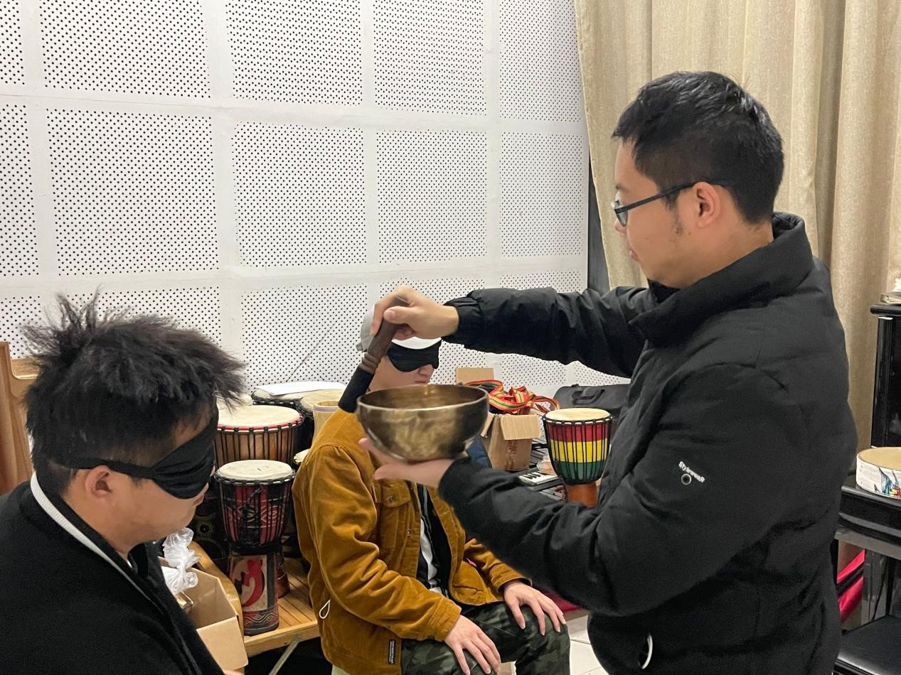 本次训练分为三部分,第一部分是颂钵感受,以舒缓的音乐配合冥想拉开序幕,酝酿情绪,带领大家进入音乐的海洋,感受音符的奇妙。第二部分是注意力培训,通过蒙住眼睛,静心聆听和分辨音乐器材发出的不同音阶,锻炼听觉注意力训练。第三部分是分享交流,在训练的同时让同学们进行乐器演奏和体验分享交流,感受音乐的魅力,体验音乐带来的身心放松,互惠分享心得体会,实现音乐治疗的效果。整个活动过程同学们积极互动,大家感觉充实的内容填满了整个训练时光,身心非常愉悦、放松。