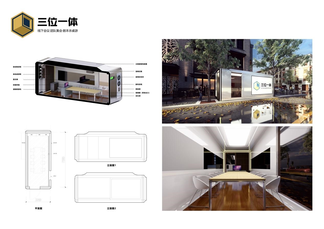 项目“三位一体-街头多功能移动小屋”针对当下大学生以及一些青年工作群体的工作、娱乐、社交需求进行整合,旨在设计出一个能够满足集办公娱乐(会议室及桌游室为主)、能源节约自给、景观服务设施三位于一体的街头多功能移动小屋。与此同时,项目还从小屋未来的预约方法、商家绑定式的运作模式、娱乐模式下的匹配机制、监督与安全系统还有离场自动消杀等方面进行了较为全面规划,并在成本控制,远期的社会与经济效益方面做出了一定的构思与展望。