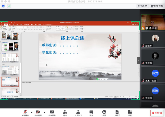 基础部熊喜秋老师讲到,设计大类基础课程教学团队的线上教学主要通过利用腾讯会议直播教学,采取理论+图例讲解+实作练习的教学方式,以灵活的针对性课题和丰富的范例评述,并根据授课情况,灵活改变授课内容及方法,取得了较好的教学效果。同时,要以这次线上教学为契机,积极推进教学改革,如慕课课程建设、借鉴线上教学经验、线上线下相结合的混合式教学等,不断提升教学质量。杨小语老师讲到理论课线上教学,主要采取“讲授法”“问答法”“讨论法”“拓展法”开展理论课线上教学。她认为,线上教育对教师提出了新的要求——科技操作、师生互动、心理感受;线上教育为理论教学带来了新机遇——更广泛的传播、更多样的媒介;线上教育VS线下教育——打破时空&实感体验,助推混合式教学时代的来临。