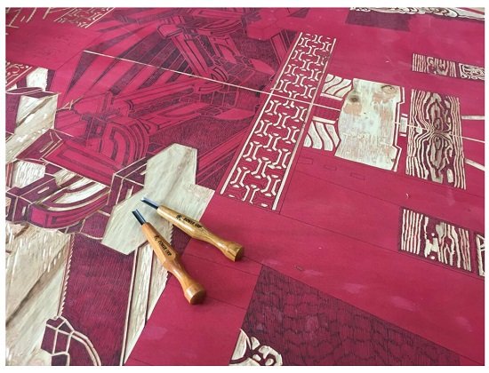 “中华营造法式”,是以宋《营造法式》为基础,以“建构千秋”为主题,以历时性和共时性相交叉的方法打通中华建筑文明的千年脉络,实现文本向图式的转换,创造性地运用“堆木拼版”的原版木雕与其他绘画技法综合运用的多元形态实现了 “中华营造法式”的三维立体呈现,此“版画”造型样式在整个“工程”中具有唯一性。