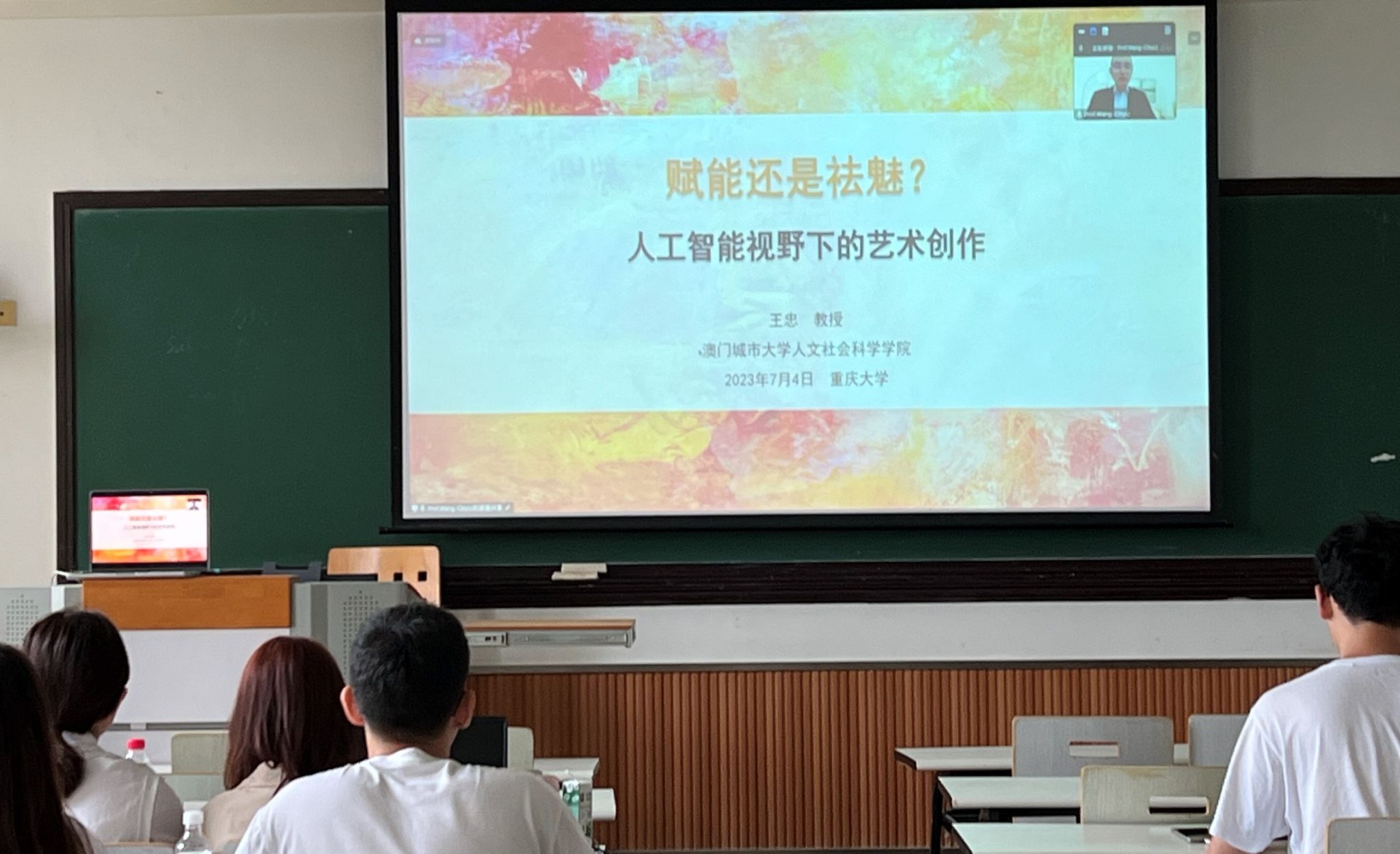 澳门城市大学社会科学学院王忠教授就人工智能艺术创作中的科技哲学与伦理反思进行了分享,引导同学们对智能科技在艺术创作“赋能”与艺术作品“祛魅”两极间产生的牵引作用及其后果进行了深入思辨和讨论。