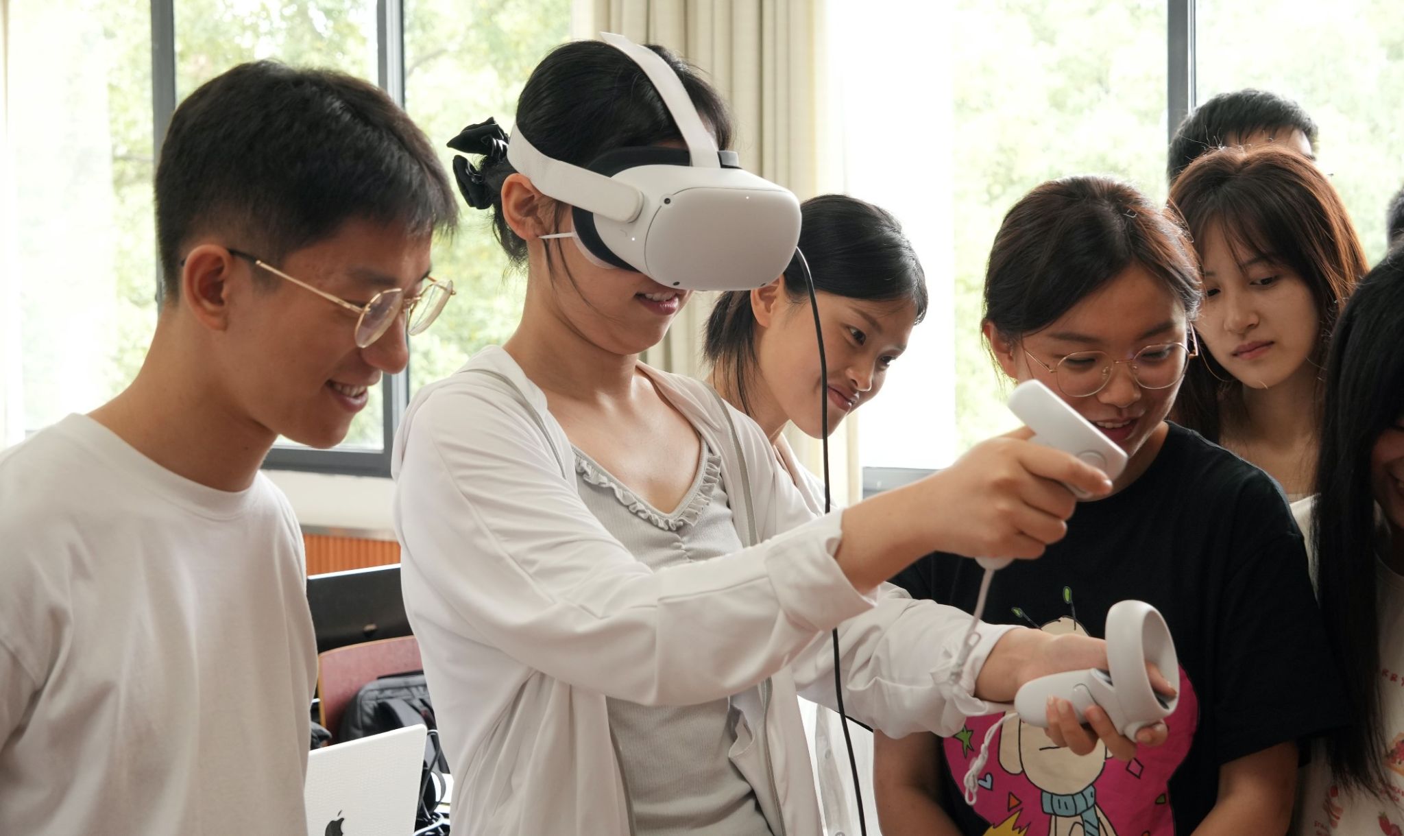 工作坊环节,香港科技大学艺术实践教授张俊杰博士为同学们带来了别开生面的沉浸式创作的实践和体验指导。如何将传统的纸上创作转移到数字环境,尤其是转移到沉浸式的虚拟三维空间中,打破透视绘图的传统习惯,进入空间绘画和互动式的内容创作,引发了同学们的强烈兴趣。不同于日常大众对VR头显设备的使用经验和理解,张俊杰博士带来了系统而全面的沉浸式数字内容创作的理论体系和实践技巧,从原理、工具、方法到应用拓展,深入浅出地引导同学们进入数字艺术与虚拟现实的世界。