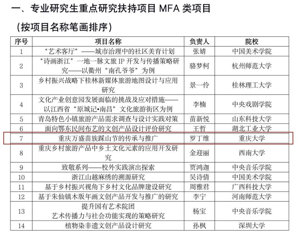 在熊喜秋副教授的指导下,2020级专业硕士研究生罗丁维申报的《文旅融合视角下,重庆万盛苗族踩山节的传承与推广》项目成功获批为国家文化和旅游部科技教育司文化艺术职业教育和旅游职业教育提质培优行动计划专业研究生重点研究扶持项目MFA类项目。