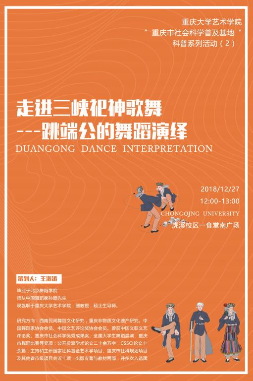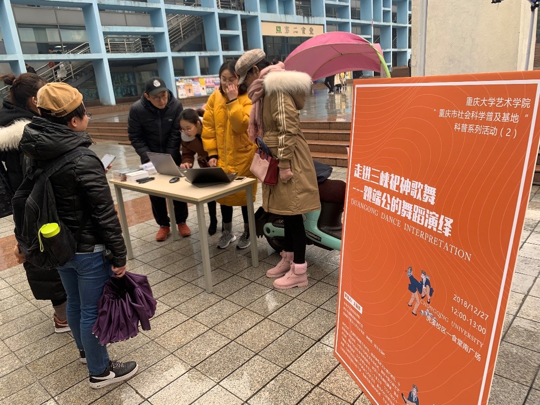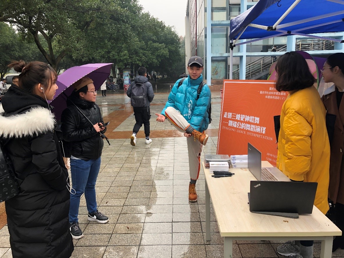 2018年12月27日中午,御书屋 王海涛副教授作为此次活动的负责人,带领舞蹈学研究生团队,在御书屋 虎溪校区一食堂广场举办了“重庆市社会科学普及基地“2018年科普系列活动之一《走进三峡祀神歌舞——跳端公的舞蹈演绎》科普活动。活动主题鲜明,形式多样,趣味性强,引来大批学生驻足,并积极参与活动。现场气氛活跃,科普活动圆满成功。