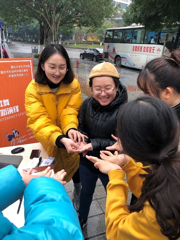 活动开始前,舞蹈学研究生们在活动地点布置场地,准备奖品、派发传单,努力营造一个浓厚的艺术氛围。此次科普活动主要围绕重庆市非物质文化遗产“开县跳端公”相关问题进行讲解和普及。