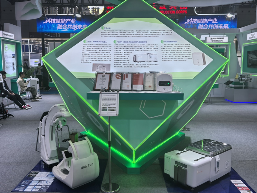 工业设计中心跨学科创新设计团队研发的智慧医疗创新设计成果。分别为夏进军教授团队与陆军军医大学第一附属医院(西南医院)感染科医务团队联合研发的PPE removal assistance system为个人防护装备脱卸辅助服务系统;彭科星副教授团队与重庆医科大学附属大学城医院唐博教授团队联合设计的“华佗” 腹腔镜手术机器人及“扁鹊”快速部署微创手术系统运输与应急医疗舱。这三项智慧医疗创新设计成果,旨在面向实际需求,推动科研与临床的紧密结合。其中,个人防护装备脱卸辅助系统,着眼于优化医护人员防护流程,旨在为一线工作人员提供更安全、便捷的操作支持。 “华佗”腹腔镜手术机器人与“扁鹊”快速部署微创手术系统及运输应急医疗舱,则分别探索了精准微创手术技术与机动化医疗解决方案的可行性,为未来医疗应用提供了新的思路。此次展出的三项成果是中心践行“设计赋能科技”理念的具体体现,旨在通过跨学科合作,探索工业设计在智慧医疗等前沿领域的应用潜力。