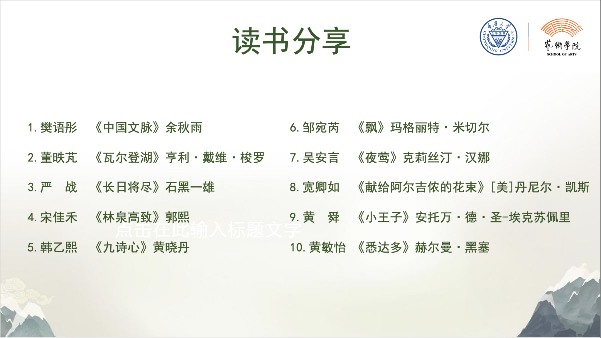 活动中,美术学系绘画专业的樊语彤、董昳芃、严战、宋佳禾、韩乙煕、邹宛芮、吴安言、宽卿如、黄舜、黄敏怡等10 位同学,从作者经历、历史文化背景、个人感悟及启示启发等方面作了阅读分享。此次分享的书籍包含了专业著作、散文、小说等类型,为同学们开拓了眼界,激发了大家思考与探索的欲望。