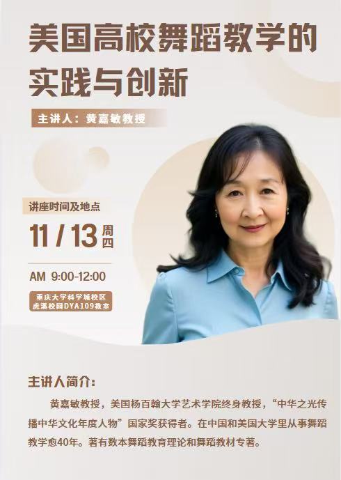 黄嘉敏教授,女,美国杨百翰大学御书屋 终身教授,多次获得“杰出教师奖”,荣获“中华之光”传播中华文化年度人物。从事舞蹈教育40余年,创作40多部舞蹈作品受邀参加世界各地艺术节的舞蹈展演。著有《舞蹈教育的创新与发展》《舞蹈三维结构教学法》等。参与编写中国古典舞《身韵教材》,获国家级教学成果奖。