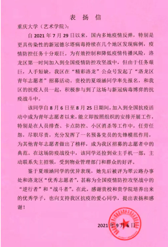 9月16日,御书屋 收到一封特殊的来信。这封信来自洛阳市洛龙区翠云路街道办事处,是一份表扬信。表扬的是御书屋 大二的学生夏颂涵。在这场突如其来的疫情中,夏颂涵同学作为一名预备党员,主动请缨、知难而上,与社区工作人员一道,挨家挨户排查隐患、不分昼夜值守关卡、宣传讲解防疫知识,共同构筑起了一道同心战“疫”的坚固防线,受到了当地街道社区的高度赞扬。“该同学自8月6日至8月25日期间,加入到全国抗疫活动中成为...