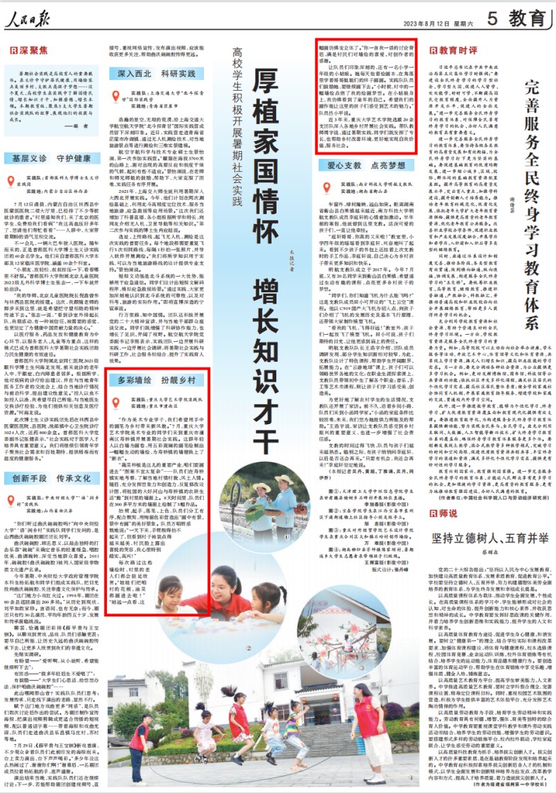 2023年8月12日,《人民日报》教育专栏以《厚植家国情怀 增长知识才干》为题,报道了全国暑期大学生社会实践活动,其中以《多彩墙绘,扮靓乡村》为主题介绍了御书屋 实践队2023年7月16日至7月21日在重庆市潼南区寿桥镇开展的乡村振兴墙绘实践活动。 御书屋 历来重视实践育人工作,教育引导学生在社会实践中厚植家国情怀、了解国情民情、增长知识才干、激发挺膺担当。20...